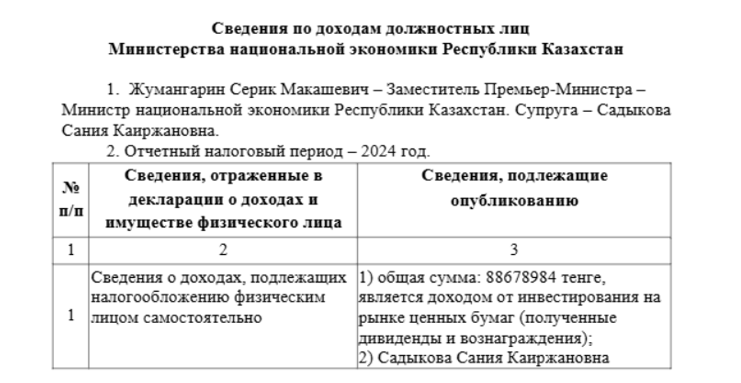 Жыл соңында ашық түрде есеп береміз деп жазда уәде берген вице-премьер, Ұлттық экономика министрі Серік Жұманғарин алғашқылардың бірі болып табысын жария етті. Құжаттарға сүйенсек, министрдің отбасы оның жұбайының арқасында шалқып өмір сүріп отырған сыңайлы. Серік Жұманғариннің әйелі Сания Садықова қор нарығында 88,6 млн теңгеден астам табыс тапқан.