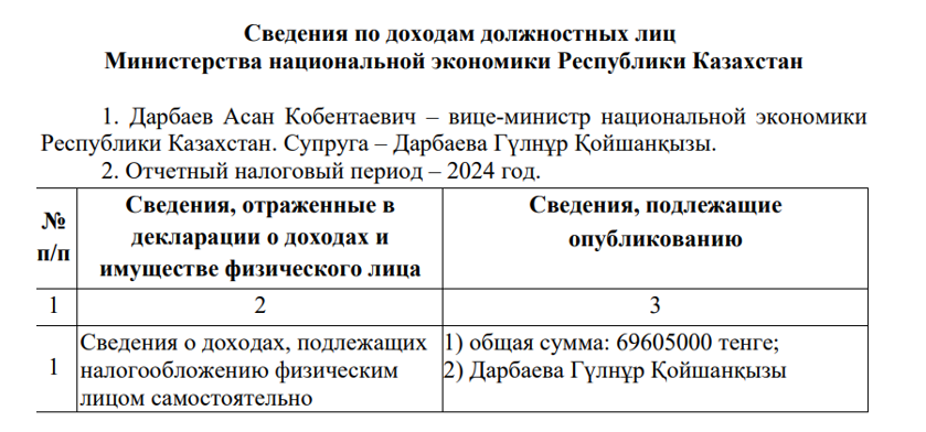 Ал Жұманғариннің орынбасары Асaн Дарбаевтың жары – Гүлнұр Дарбаева 2024 жылы шамамен 70 млн теңге табыс тауыпты.