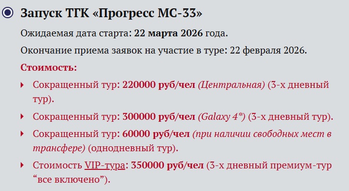 Baikonurtour.ru сайтында «Прогресс МС-33» ұшуына куә болғысы келетіндерге төрт түрлі тариф ұсынылған. Ең арзан тур – 60 мың рубль(384 мың теңге) болса, ең қымбаты – 350 мың рубль (2,2 млн теңге) тұрады. Қызметтің барлық түрі енгізілген премиум-тур үш күнге созылатыны нақтыланған.