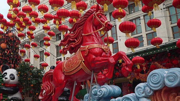 Қытай Жаңа жылында көшелер, үйлер, ғимараттар қызыл фонарьлармен, ленталармен, ою-өрнектермен безендіріледі. Қызыл түс – сәттілік пен байлықтың символы.