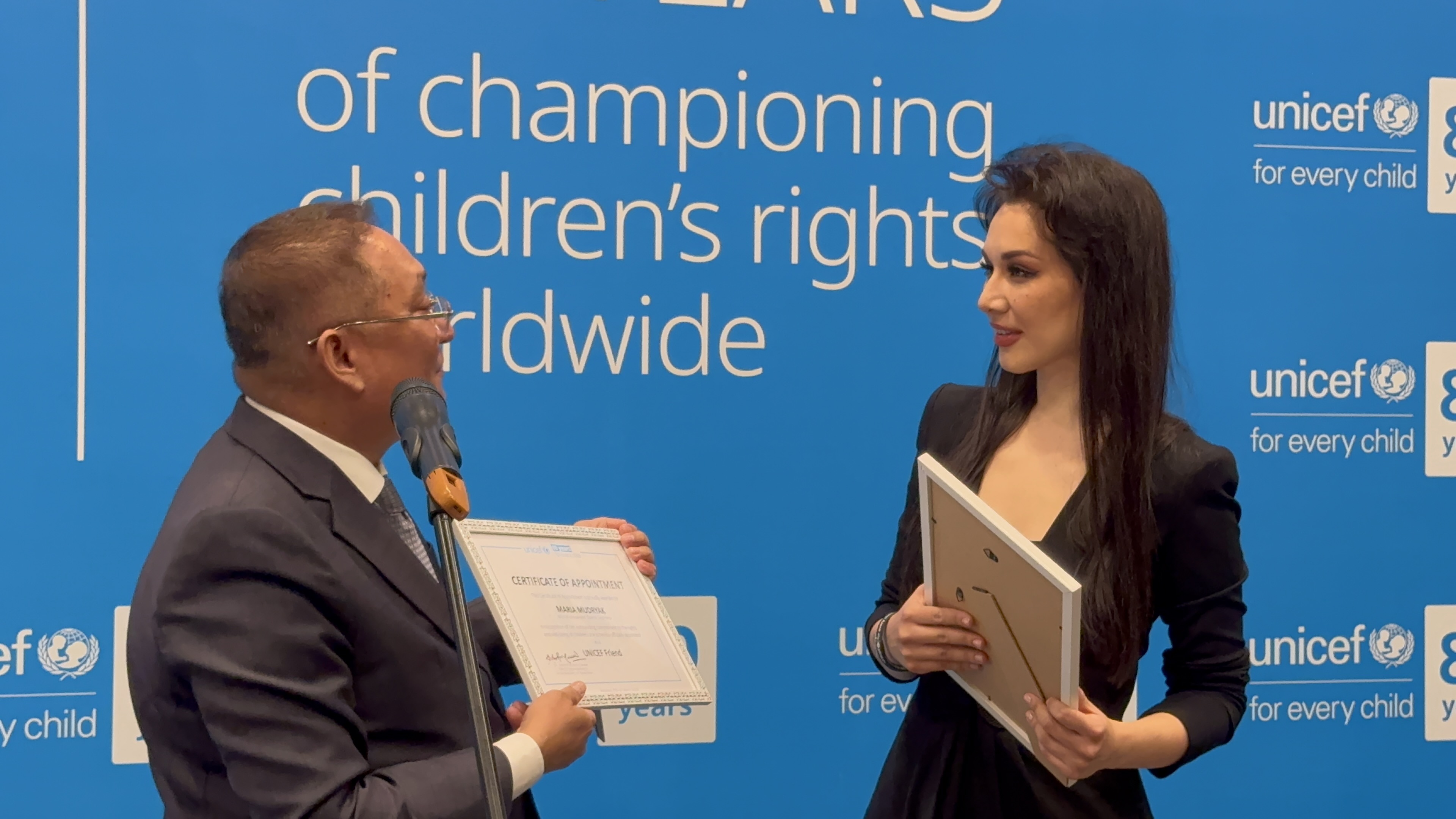 Сертификат UNICEF Friend Марии Мудряк вручил представитель ЮНИСЕФ в Казахстане Доктор Рашед Сарвар. Он тепло поприветствовал её словами: «Добро пожаловать в семью».
