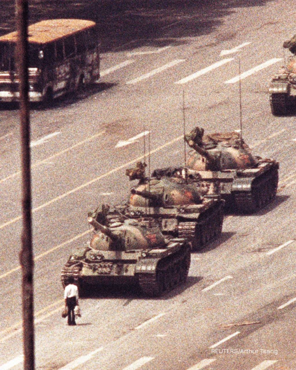 Техника пыталась объехать его, но он снова вставал на пути. Позже его увели с дороги, его личность и судьба остаются неизвестными. Фото и видео этого эпизода облетели весь мир.