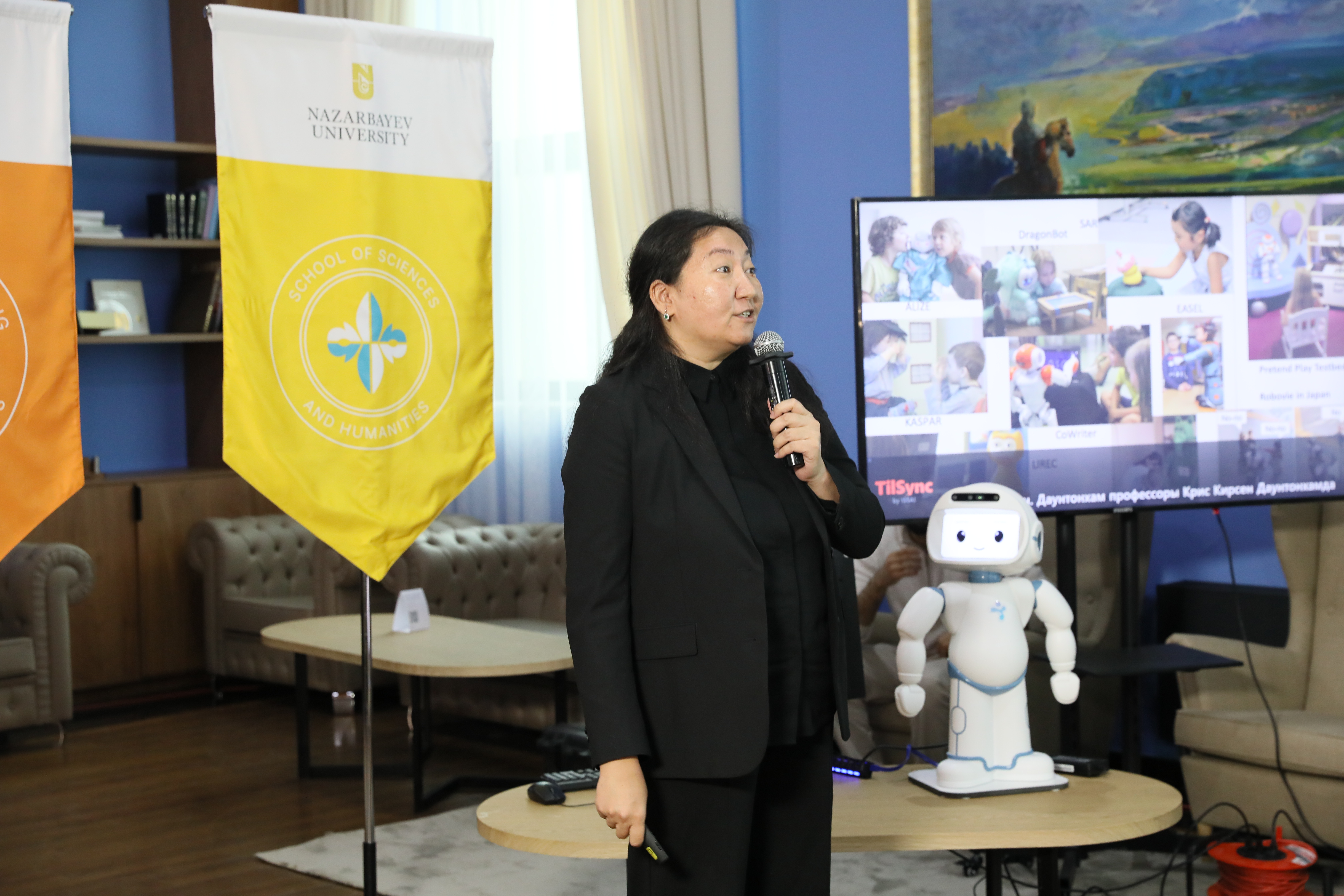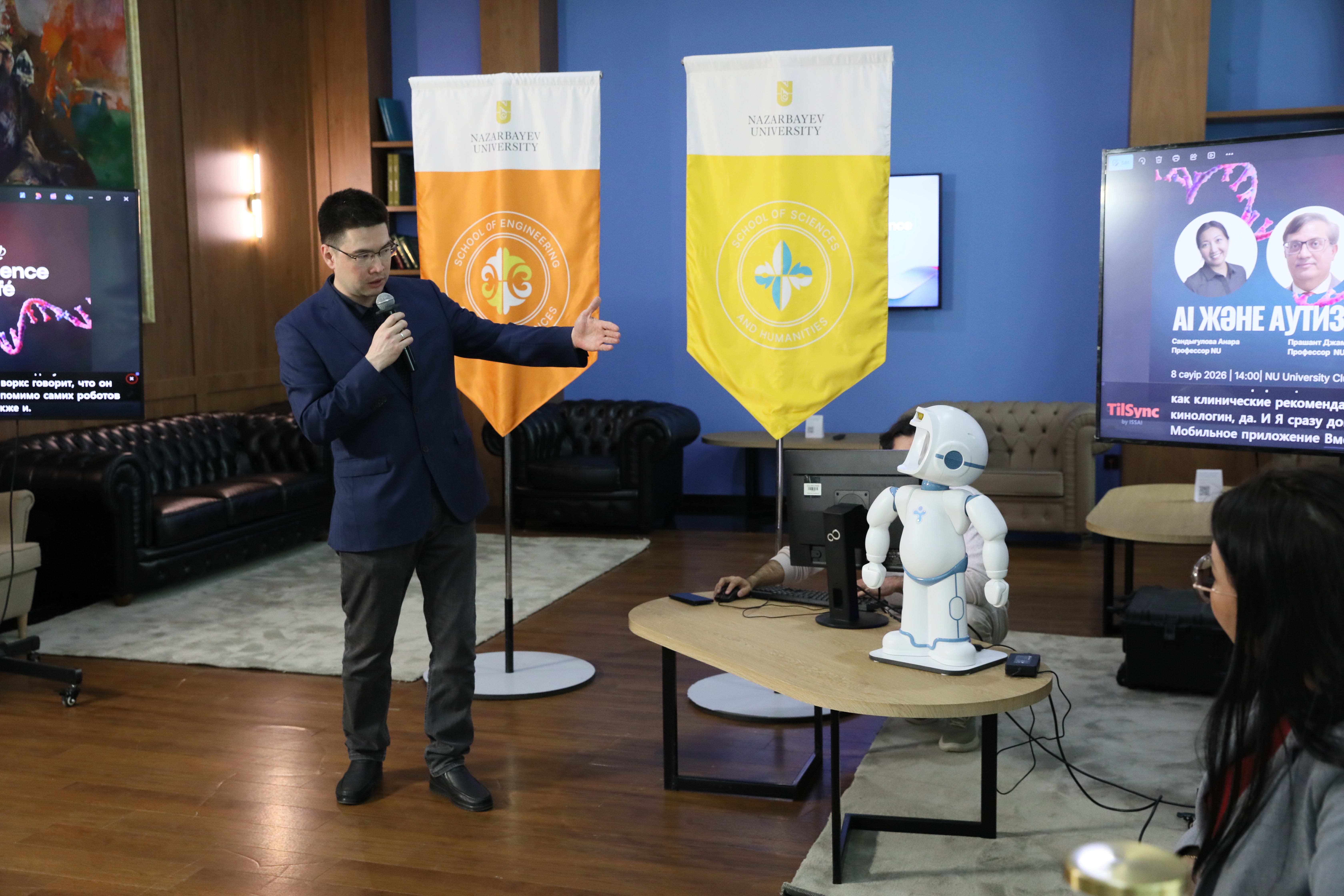Профессора Nazarbayev University Анара Сандыгулова, Айбек Ниеткалиев и Прашант Джамвал представили журналистам инновационного социального робота на базе искусственного интеллекта, предназначенного для терапии детей с расстройствами аутистического спектра.