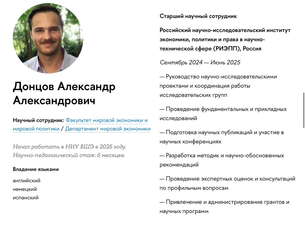 Ряд российских СМИ и телеграм-каналов сообщили, что Донцов работает в НИУ ВШЭ.