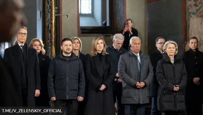 Ғибадатханаға Украина басшысы Владимир Зеленский, оның жұбайы Елене және бүгін Киевке арнайы келген Еуропа елдерінің басшылары жиналды.
