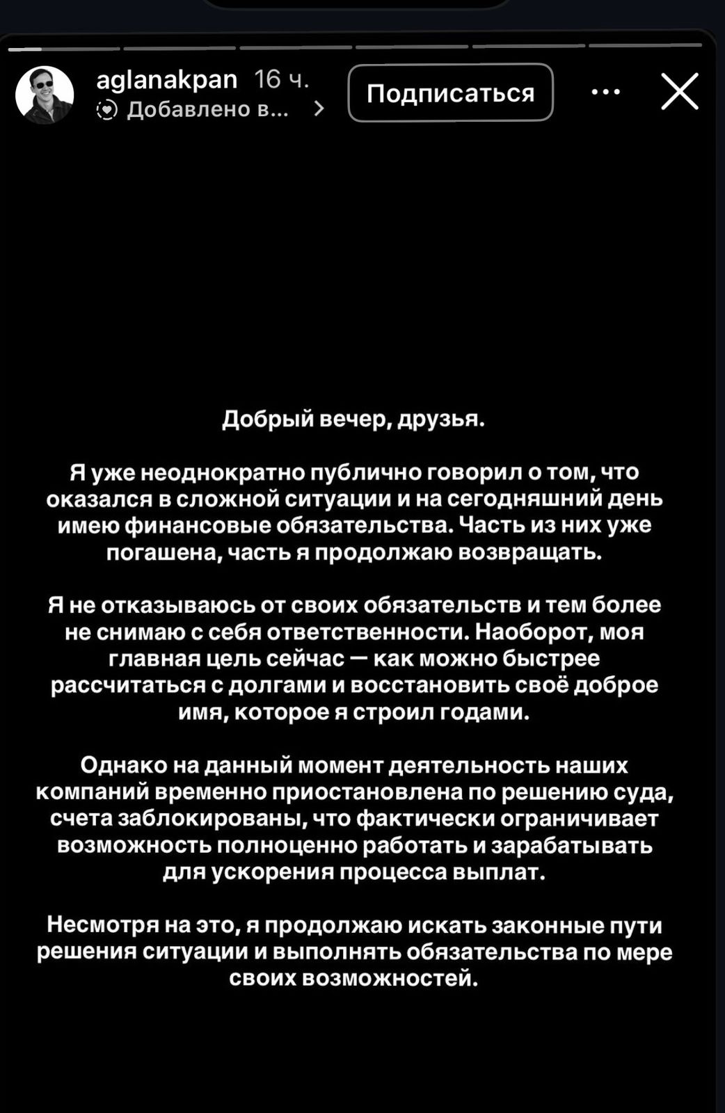 Ол қаржылық міндетемелерінің бір бөлігін өтегенін, қалғанын әлі де қайтарып жатқанын мәлімдеді. Блогер өз жауапкершілігінен бас тартпайтынын, керісінше, қарыздарды мүмкіндігінше тезірек өтеуге тырысып жатқанын жеткізді.