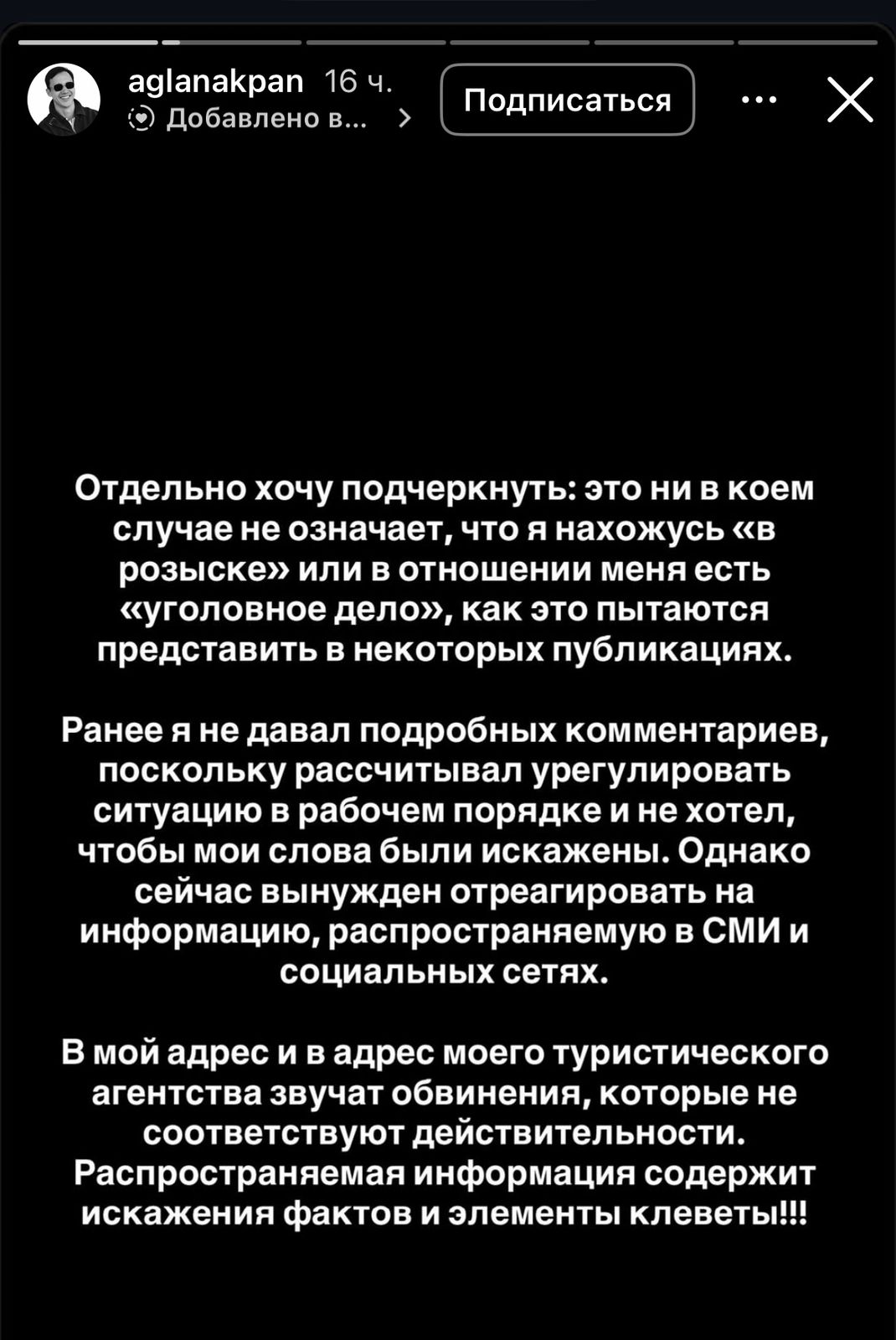 «Жеке атап өткім келетіні: бұл ешқандай жағдайда менің «іздеуде жүргенімді» немесе маған қатысты «қылмыстық іс» қозғалғанын білдірмейді, кейбір жазбаларда мұны дәл солай көрсетуге тырысып жатыр. Менің және туристік агенттігімнің атына шындыққа жанаспайтын айыптаулар айтылып жатыр. Таралып жатқан ақпаратта фактілер бұрмаланған және жала жабу белгілері бар!» – дейді блогер.
