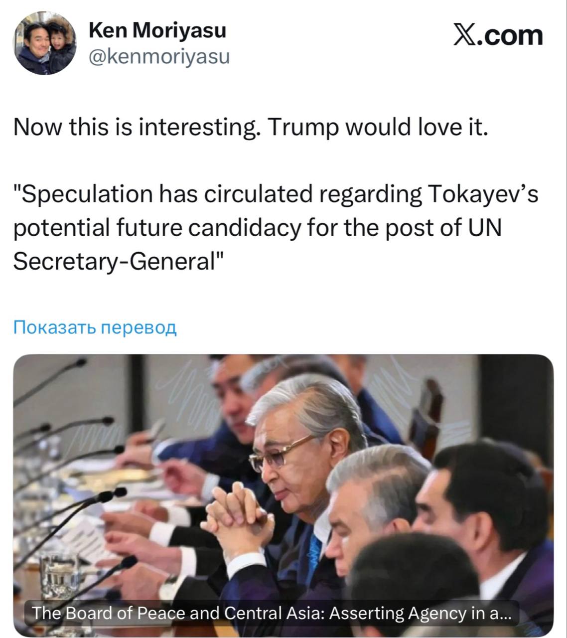 «Егер Тоқаев БҰҰ-ның келесі Бас хатшысы ретінде қаралып жатыр десем, бұған ешкім таңдана қоймайды. Бұл өте мықты фигура. Ол талай жыл дипломат болды, Женевада жұмыс істеді. Америкалықтар оны өте байсалды ойыншы ретінде қарастырады», – дейді Венедиктов.